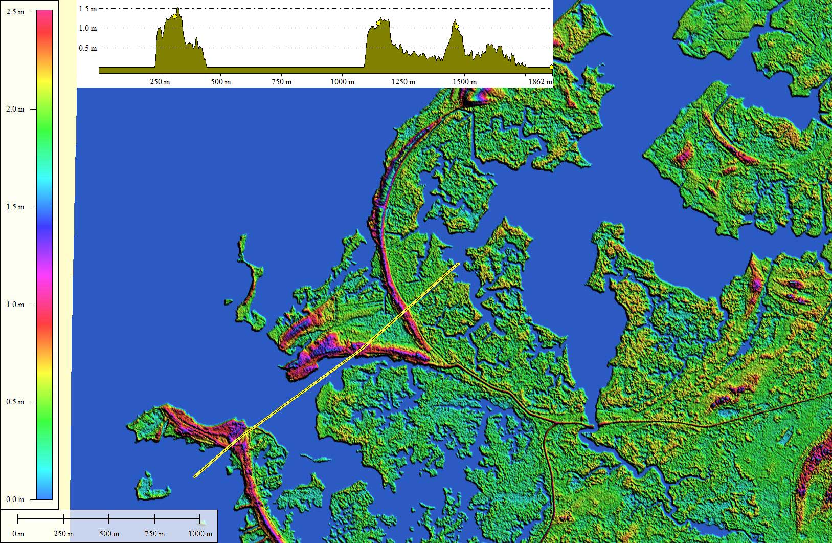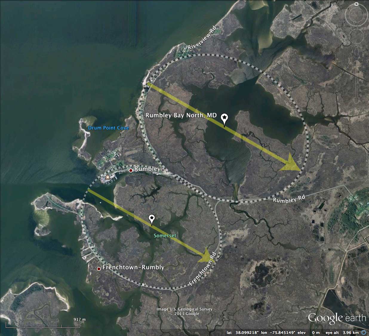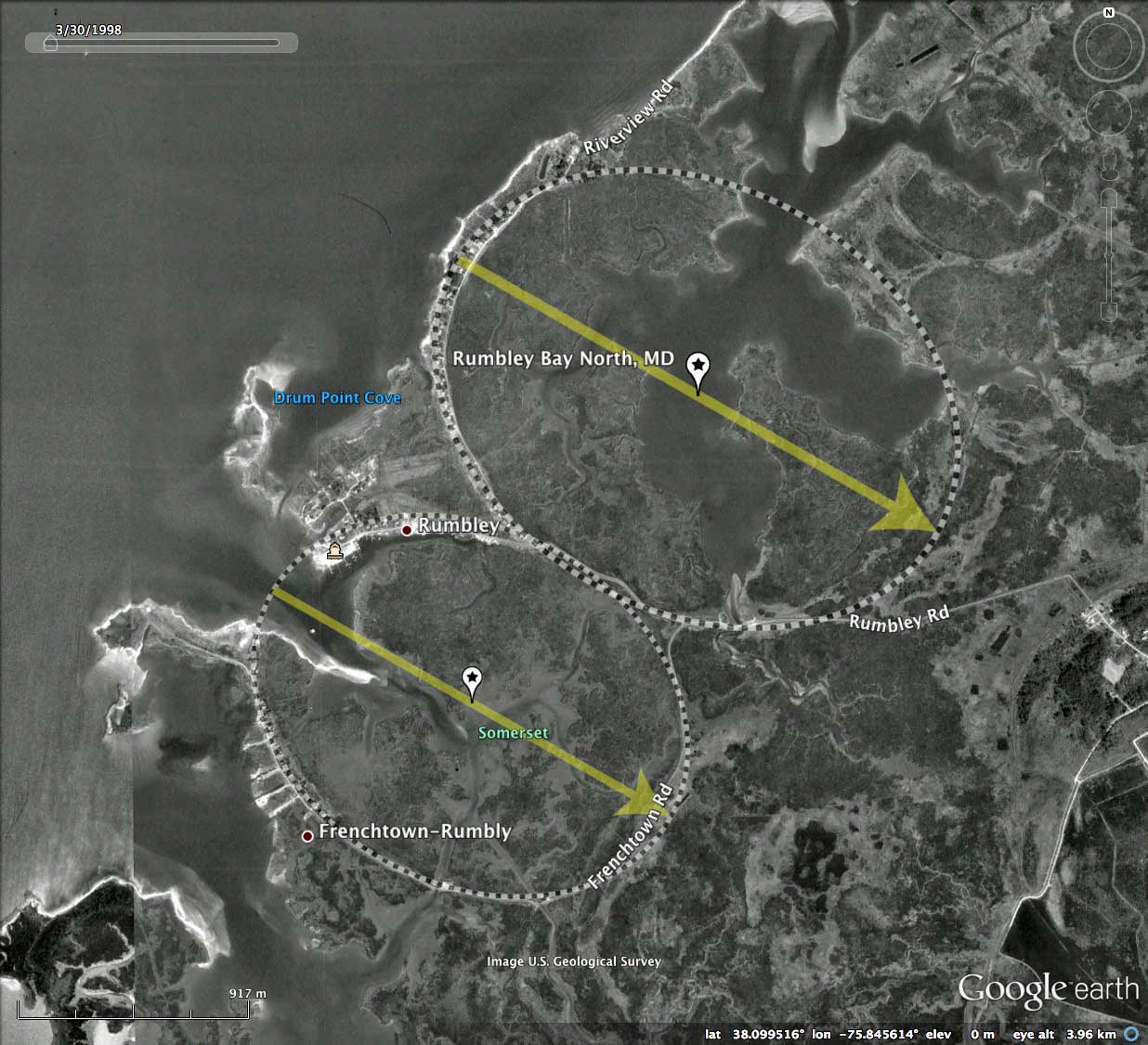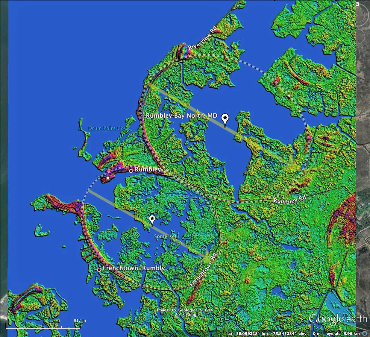 Presented here are two individual bay landforms which have been associated under the name "Rumbley Bays". The largest, with a major axis of 2.34 kilometers, is our survey index # 152303_3938. The other is our index # 152303_3442, with a major axis of 1.94 kilometers. These two bays have the same orientation of 140.69, and are robustly represented by the bayOval archetype shape. The bay "floors" are today at sea level, and the rims stand less than 1.5 meters above sea level.