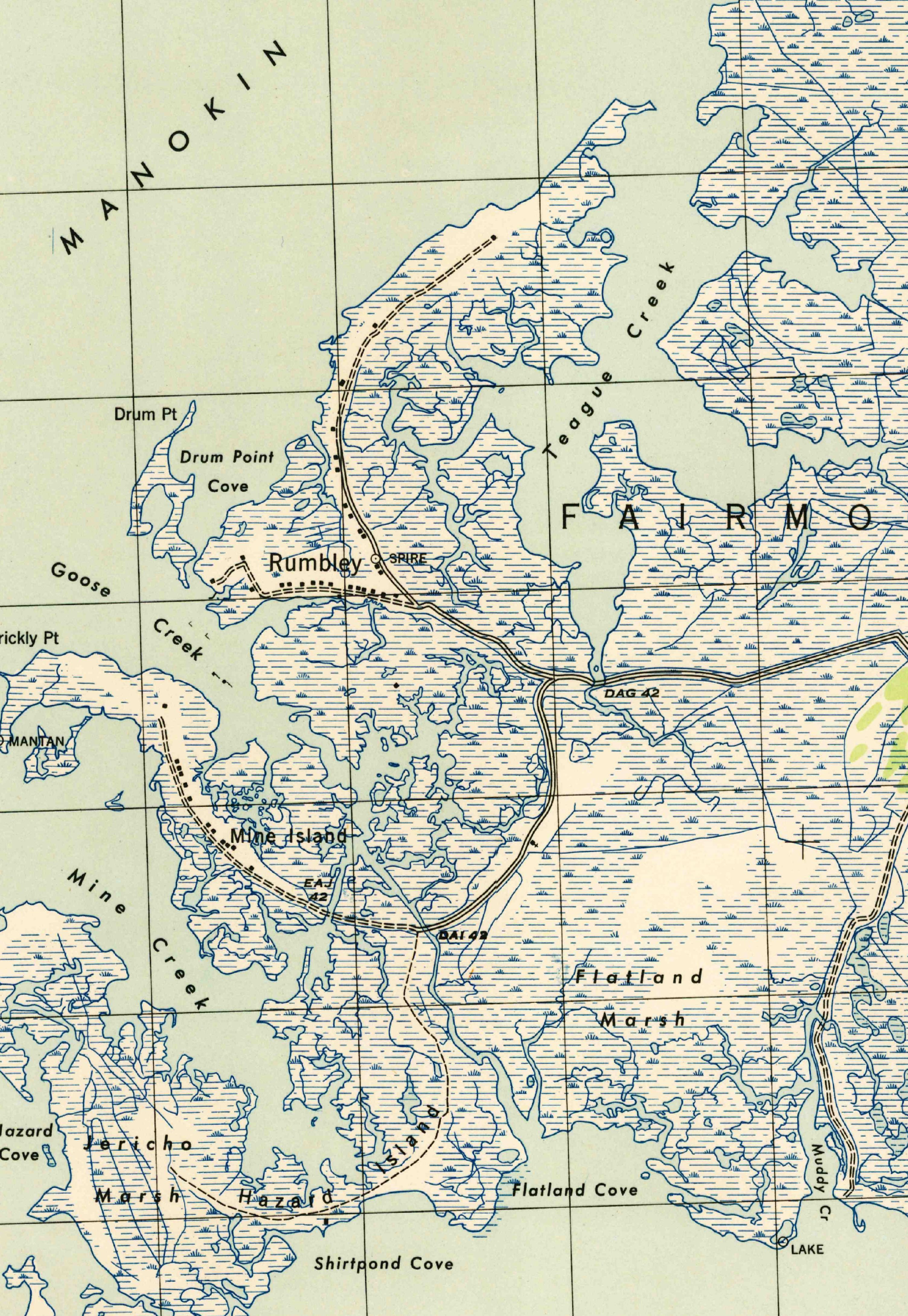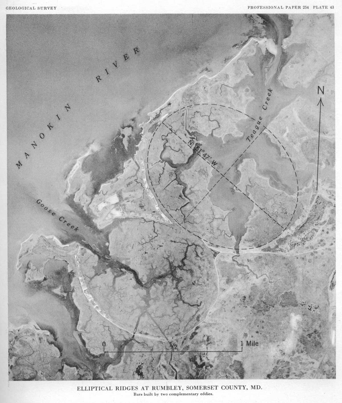 …houses are strung out in single file along a V-shaped ridge averaging 100 feet or less in width and rising generally less than 5 feet above sea level. This V-shaped ridge appears to include adjacent segments of bars built by two tangent elliptical eddies, the northeasterly one flowing clockwise and the other counterclockwise. The soil consists of rather coarse, well-rounded sand grains mixed with much finer silt. Salt marshes occupy much of the area within the ellipses, except the drowned channels of Goose Creek and Teague Creek; and there are irregular areas of salt marsh outside the ellipses fronting Manokin River, an arm of Tangier Sound.
