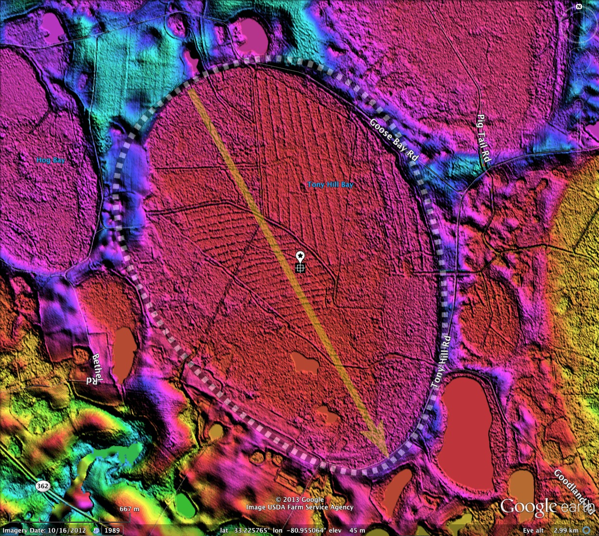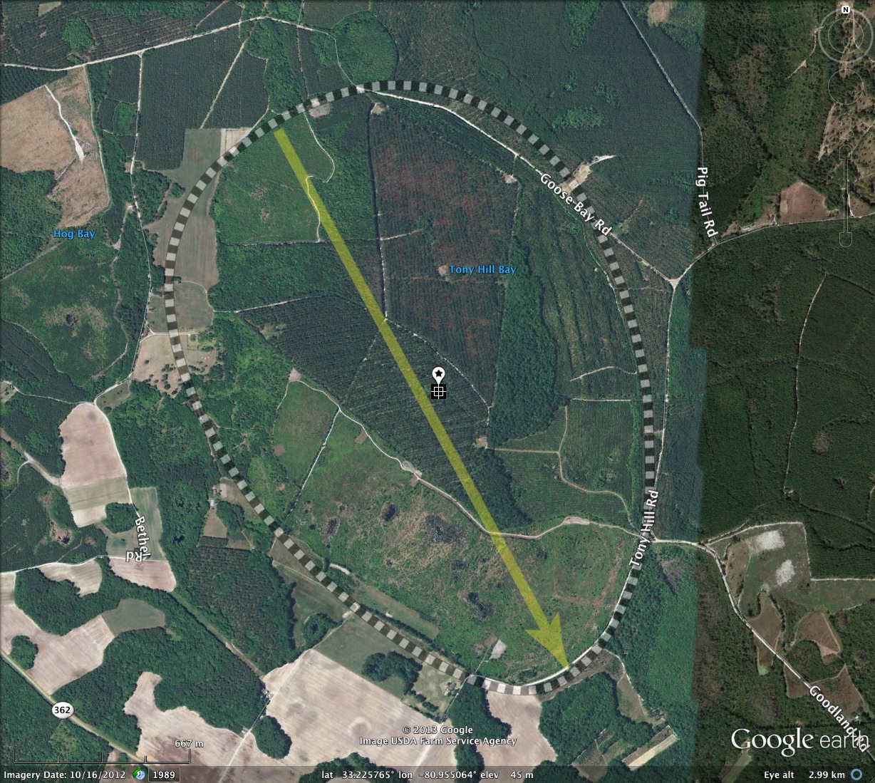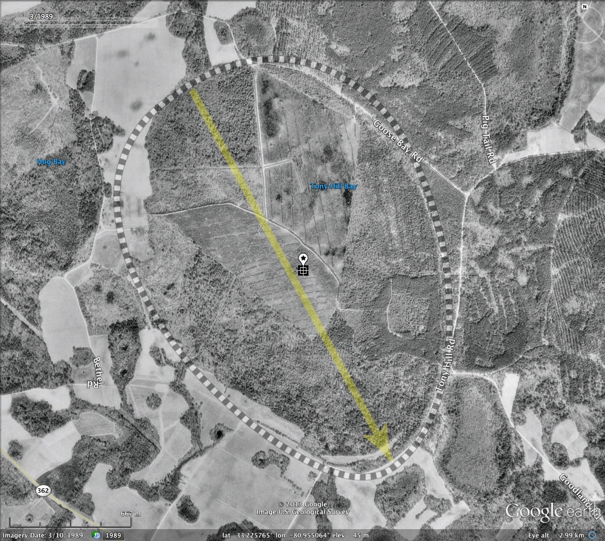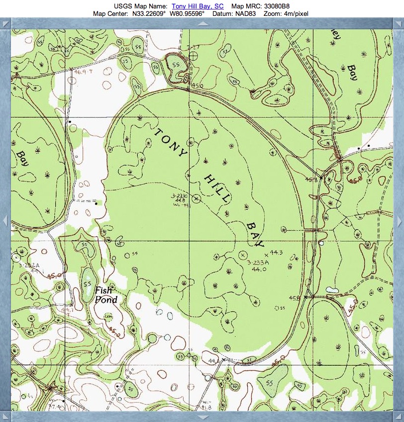 Tony Hill Bay is located 10 kilometers southeast of Bamburg, SC. The bay matches the baySouth archetype quite well, and is orientated similarly to other bays in the immediate area. With a major axis of over 2.39 kilometers, Tony Hill Bay is among the 200 largest bays in our survey of 50,000 bays.